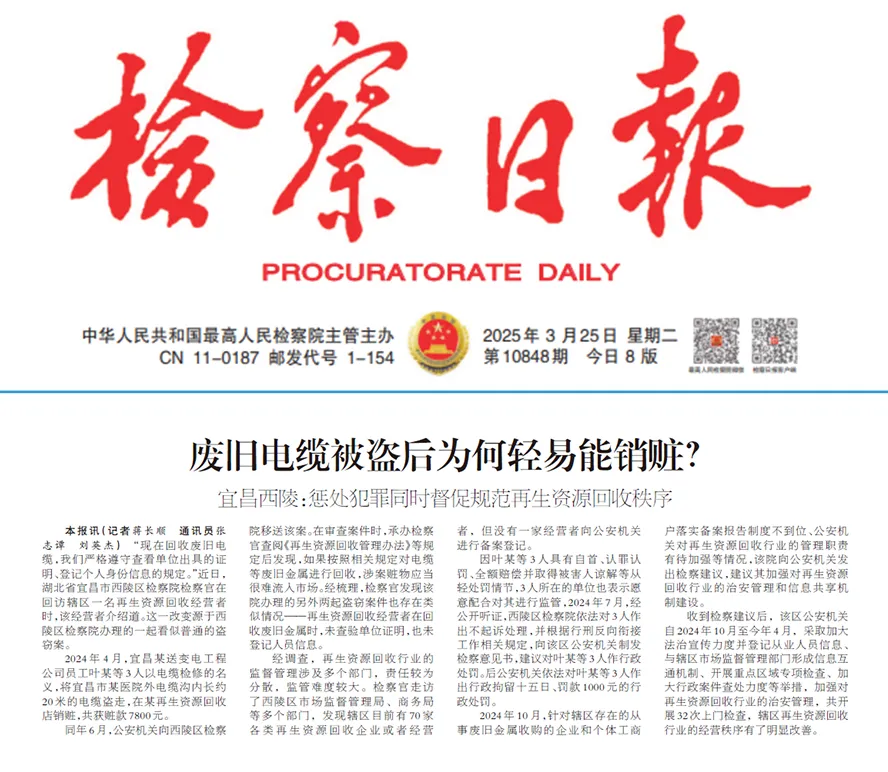 “现在回收废旧电缆,我们严格遵守查看单位出具的证明、登记个人身份信息的规定。”近日,湖北省宜昌市西陵区检察院检察官在回访辖区一名再生资源回收经营者时,该经营者介绍道。这一改变源于西陵区检察院办理的一起看似普通的盗窃案。