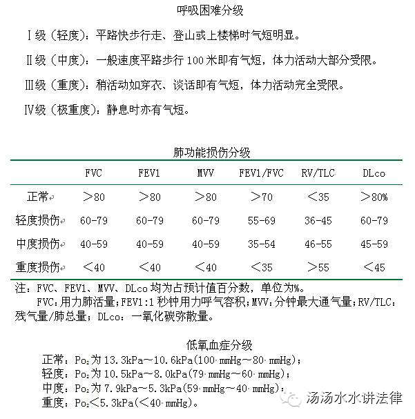 12.呼吸功能障碍判定:参照《道路交通事故受伤人员伤残评定》(GB 18667-2002)和《劳动能力鉴定--职工工伤与职业病致残程度鉴定标准》(GBT16180-2006),结合医学实践执行。症状:自觉气短、胸闷不适、呼吸费力。体征:呼吸频率增快,幅度加深或者变浅,或者伴周期节律异常,鼻翼扇动,紫绀等。实验室检查提示肺功能损害。在保外就医诊断实践中,判定呼吸功能障碍必须综合产生呼吸功能障碍的病理基础、临床表现和相关医技检查结果如血气分析,全面分析。