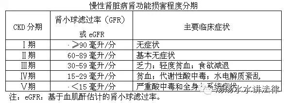 14. 急、慢性肾功能损害程度判定:参照《实用内科学》(第十三版)和《内科学》(第七版)进行综合判定。急性肾损伤的原因有肾前性、肾实质性及肾后性三类。每类又有少尿型和非少尿型两种。慢性肾脏病患者肾功能损害分期与病因、病变进展程度、部位、转归以及诊断时间有关。分期: